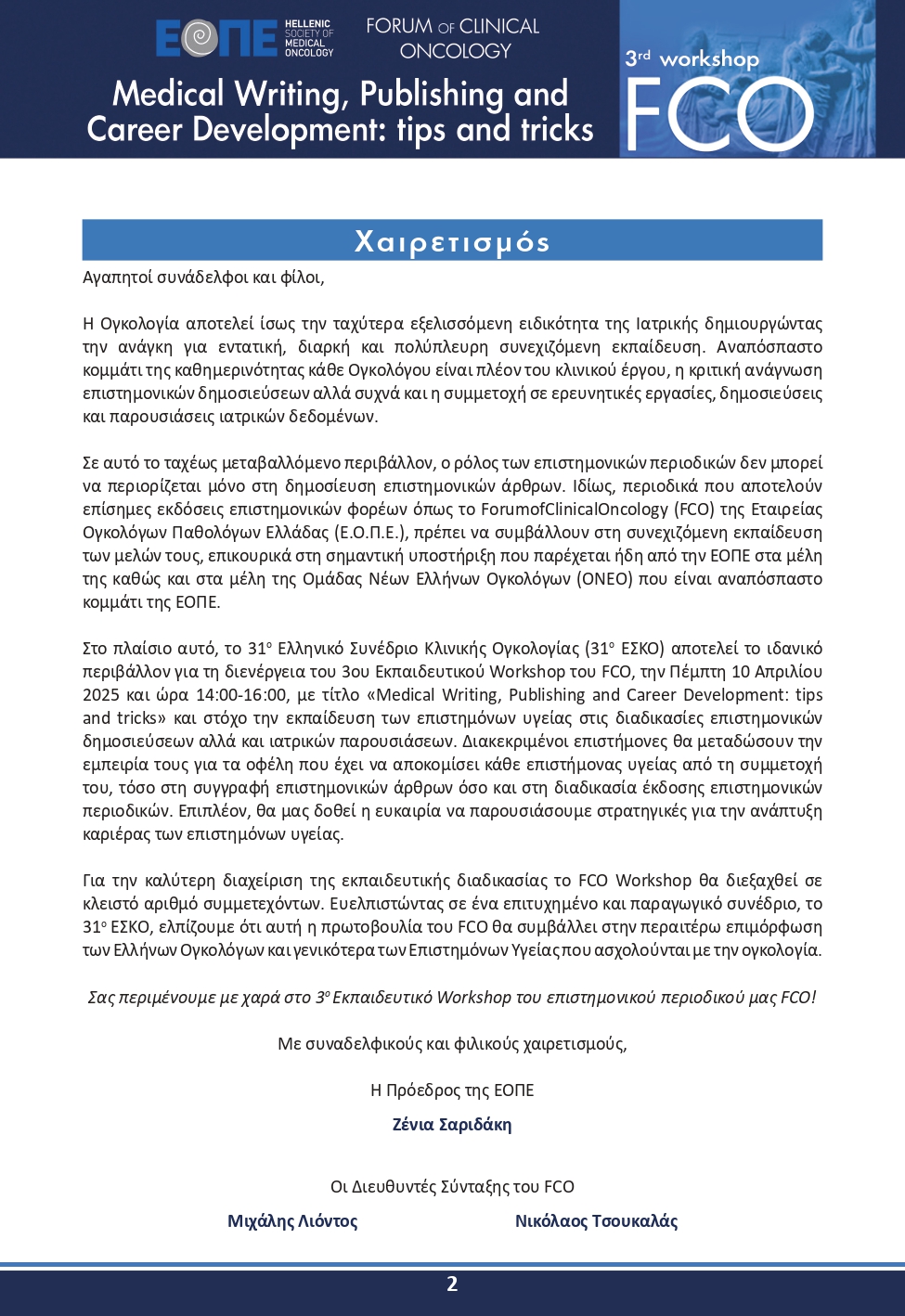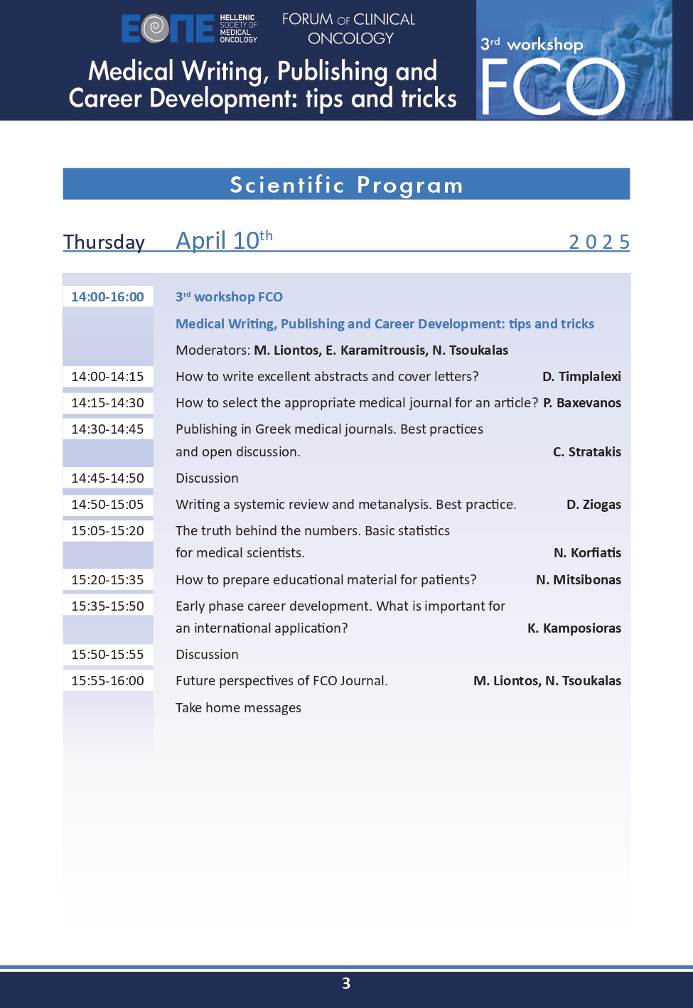 Με προσέλευση που ξεπέρασε κάθε προηγούμενο, πραγματοποιήθηκε το 3ο Εκπαιδευτικό Workshop του FCO, με τίτλο «Medical Writing, Publishing and Career Development: tips and tricks». Στόχος του ήταν η εκπαίδευση των επιστημόνων υγείας στις διαδικασίες επιστημονικής συγγραφής, δημοσίευσης αλλά και παρουσίασης.